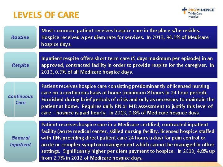 2013 8 Continuous Home Care Payment for continuous home care may be made for up to 24 hoursday Requires a minimum of eight hours of care during a 24-hour period that begins and ends at midnight More than half of the care in any 24-hour period must be provided by a RN or LPNLVN Billable time stops when patient dies. Hospice offers four levels of care as defined by Medicare to meet the varying needs of patients and their families. Continuous Hospice Care is similar to inpatient care except for the fact that the patient remains in their home instead of being admitted to an inpatient care facility.
